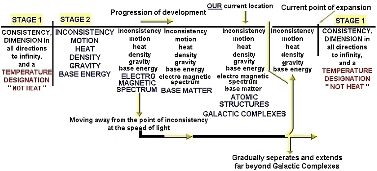 During STAGE ONE, a POINT OF INCONSISTENCY changed the universe from having a CONSISTENT value to having an INCONSISTENT VALUE.  This was the beginning of STAGE TWO.  The point of inconsistency established motion, density, gravity, and heat.  These properties created the stress which created an even greater inconsistency.  As this process continued, enough FREE FROM GRAVITY was created to attract to itself with enough intensity to create the density necessary to form BASE ENERGY, then COMPLEX ENERGY, then BASE MATTER, and finally COMPLEX MATTER which is why gravity is a (3) dimensional attractive force at all indivisible points that exists.